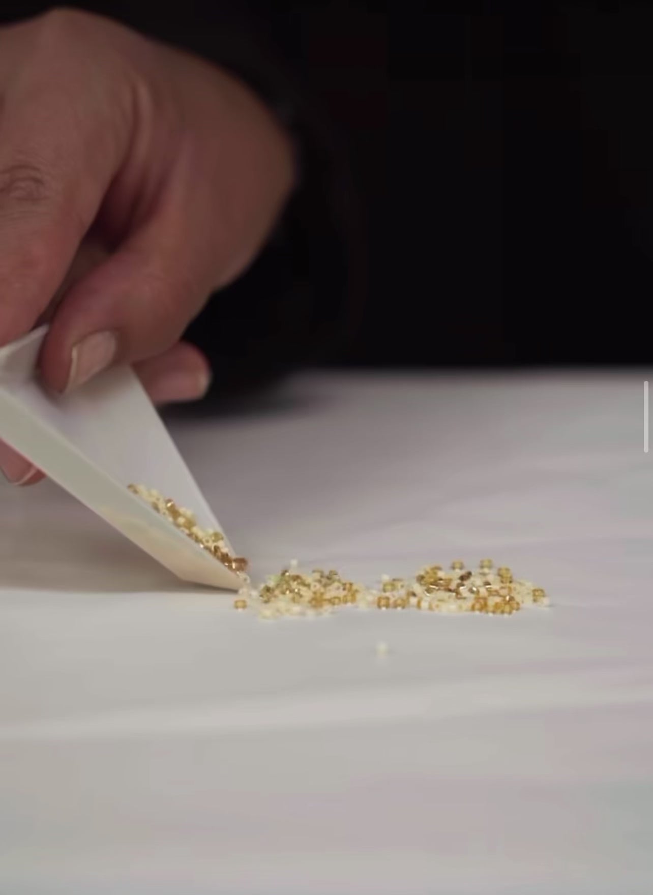 Trabajamos con rocalla Miyuki, cuentas de cristal japonés de alta pureza, sin plomo y de una uniformidad perfecta. Su precisión milimétrica permite tejidos limpios, definidos y muy ligeros, ideales para joyería artesanal de alta gama.